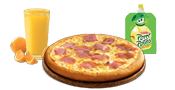 1 mini pizza jambon (Sauce tomate, mozzarella, jambon*) ou mozza (Sauce tomate, mozzarella) ou 5 nugget + 1 capri-sun + 1 Pom’potes